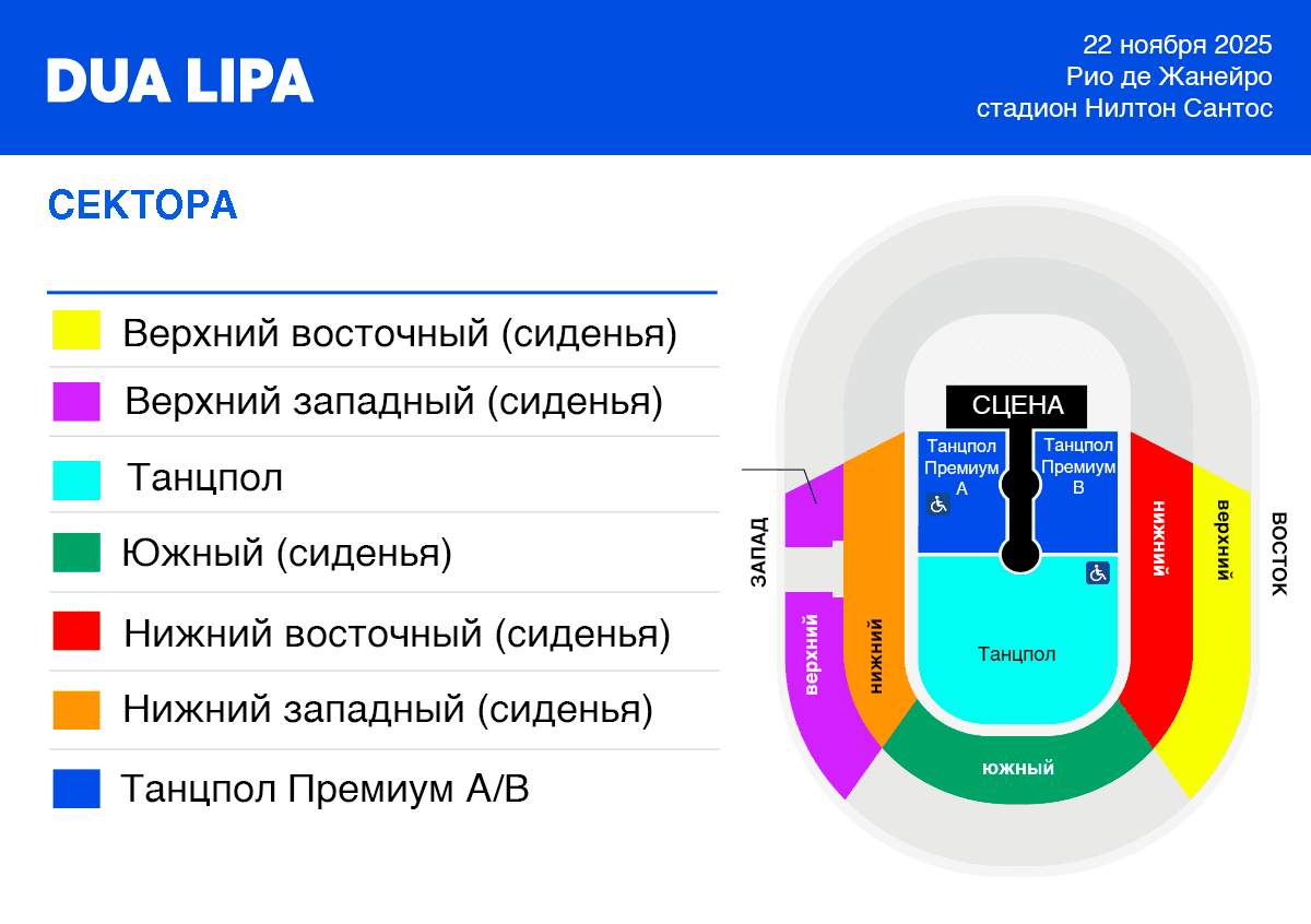 Премиум-секторы (танцпол) A и B не соединены между собой, и переход болельщиков между двумя сторонами разрешен не будет. Также никакие обмены производиться не будут. Внимательно проверяйте перед покупкой.